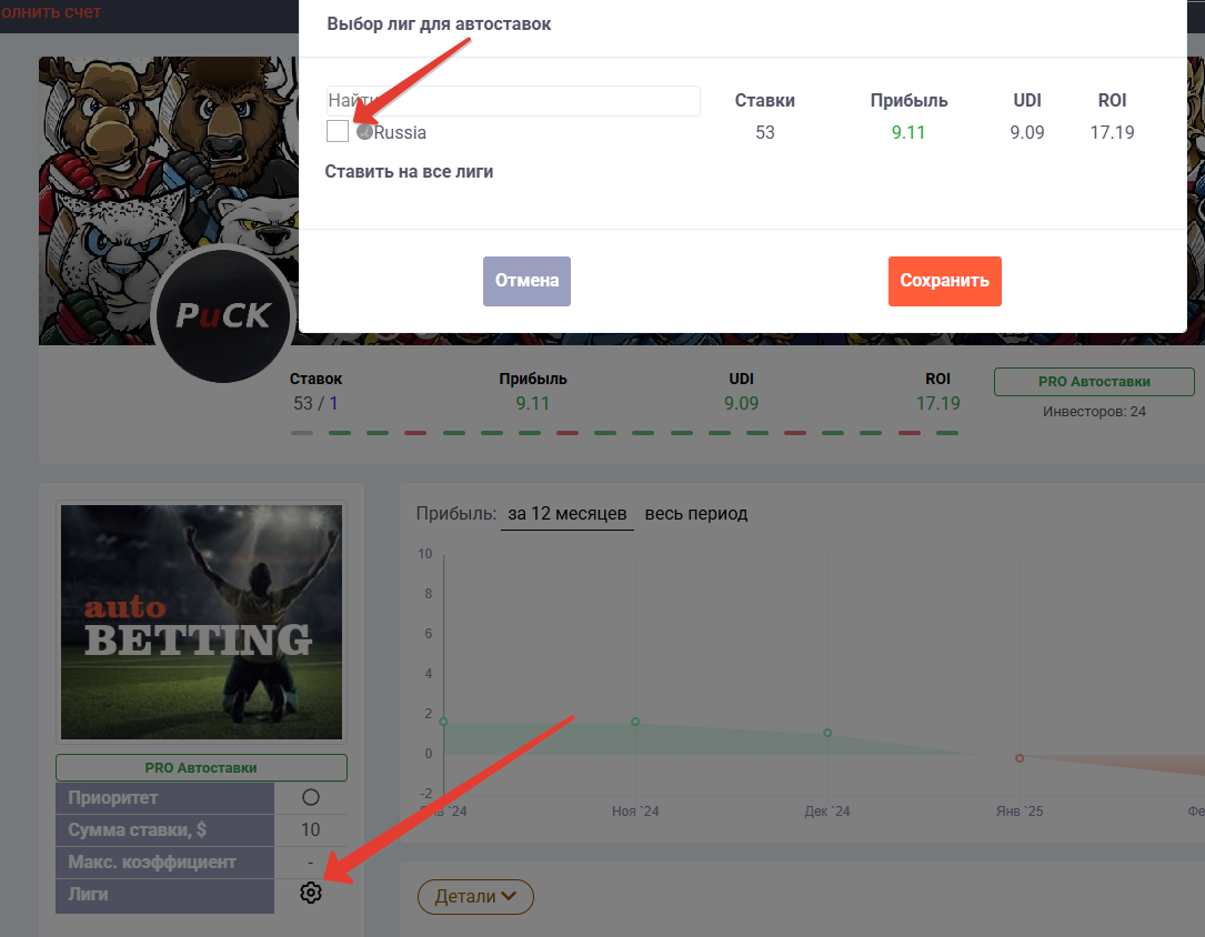 По умолчанию, все лиги активированы, но если вы поставите галочку рядом с одной из лиг, то автоставки будут размещаться только по выбранным вами лигам.